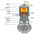 スコットランドの牧師スターリングRobert Stirling(1790―1878)が発明した(特許出願1816年)、シリンダー内に空気、窒素、ヘリウムなどの気体を封入し、その気体を外部から加熱・冷却して膨張・収縮させ、ピストンを動作させる方式の外燃機関。スターリング機関ともいう。高出力を得るために高い圧力(高いものでは15メガパスカル)で動作させるのが一般的である。エンジンは、サイクルごとにシリンダー壁面の加熱と冷却を繰り返すことを避けるために、作動ガスを高温部と低温部に分け、それを空洞のピストンで仕切ったり、別のシリンダーに分けたりする。この二つの空間の間に積層金網などの微細構造の蓄熱材を入れた容器(再生器)がつながれる。収縮と膨張の前後で作動ガスが再生器を往復し、温度勾配(こうばい)のある蓄熱材に小さな温度差ですばやく熱を預け、またそれを回収する。これによって圧力の振幅を得、効率よく動力を生み出す。ピストンを機構で動かす形式のほかに、リニア発電機を駆動するフリーピストン式もある。逆サイクル(冷凍サイクル)も容易に実現でき、実用化されており、極低温の冷凍機は競争力もある。熱源を選ばないエンジンであり、太陽熱発電、バイオマス発電などの原動機として実用化が期待されている。100キロワット以下のエンジンが開発され、日本では、静粛性の特徴を生かし、海上自衛隊の「そうりゅう」型潜水艦での使用例などがあるが、コストが高く普及していない。