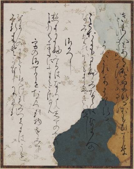 さまざまな色の唐紙で破り継ぎを施したもの。伝藤原公任(きんとう)筆『伊勢集』(断簡) 平安時代 (12世紀) 彩箋(さいせん)墨書 九州国立博物館