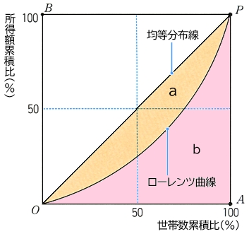 の面積(a+b)の比で表される。これを式で表すと、ジニ係数=a÷(a+b)となる。ジニ係数は0から1の値をとり、0に近いほど平等で、1に近いほど不平等度が高いことを示す