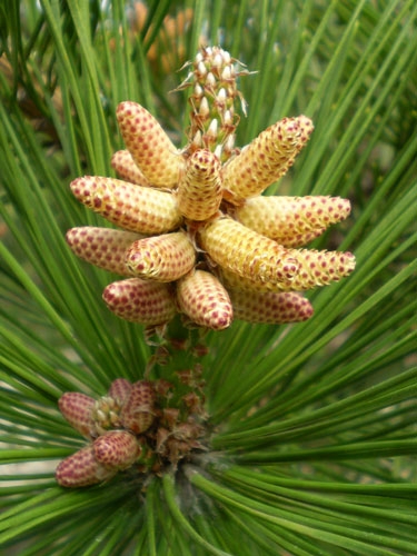 多数の雄花(鱗片(りんぺん))が密に重なった楕円(だえん)形で、新しい枝の基部に群生してつく