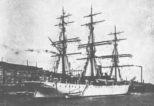 深川区越中島(えっちゅうじま)町(現在の東京都江東区越中島)の校舎と練習船明治丸。『東京府名勝図絵』(1912年〈明治45〉)