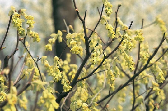 3~4月、葉に先立って、下垂する穂状花序に淡黄色の花を7~10個つける。古くから観賞用に栽培され、現在でも庭園樹として植栽されている